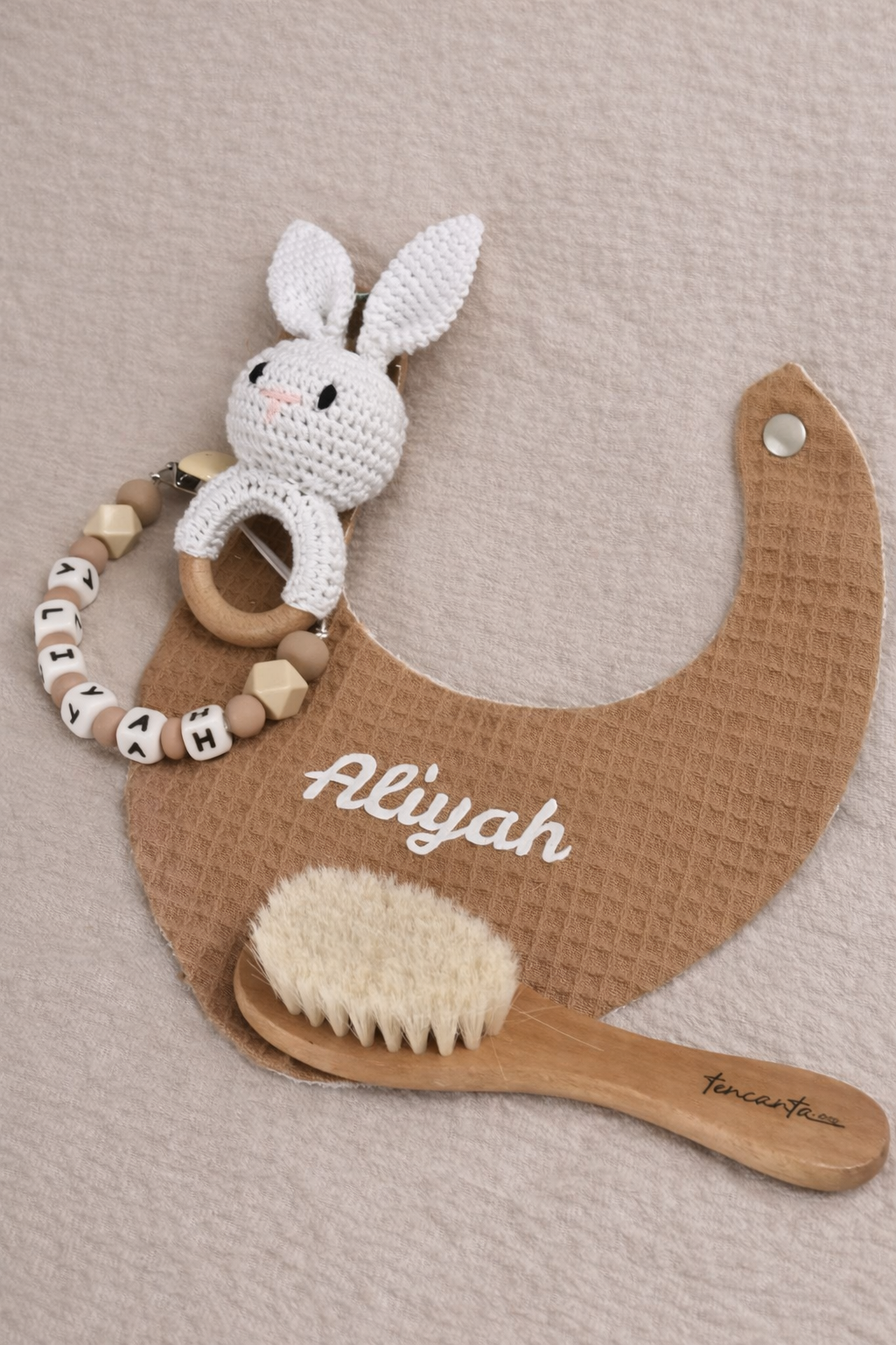 Un regalo perfecto para celebrar la llegada de un nuevo bebé. Este pack personalizado combina funcionalidad y belleza, con piezas cuidadosamente seleccionadas y hechas a mano.
