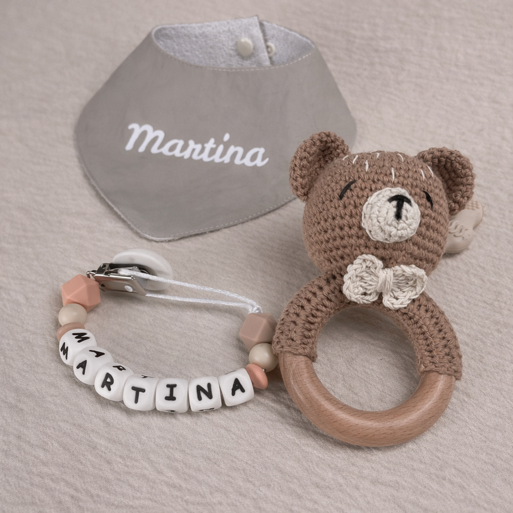 Cada pieza ha sido creada con cariño, combinando la belleza de la madera con la suavidad de la silicona, haciendo que este pack sea tanto funcional como memorable. Ideal para celebrar la llegada de un nuevo bebé o para sorprender a los padres con un regalo que será recordado para siempre.